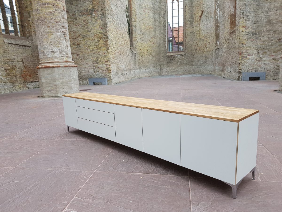 Tv Meubel Van Mdf En Frans Eiken Hout Interieur Timmerwerken Schomaker , Dressoir Fleur, Wit Met Vergrijsd Houten Blad.